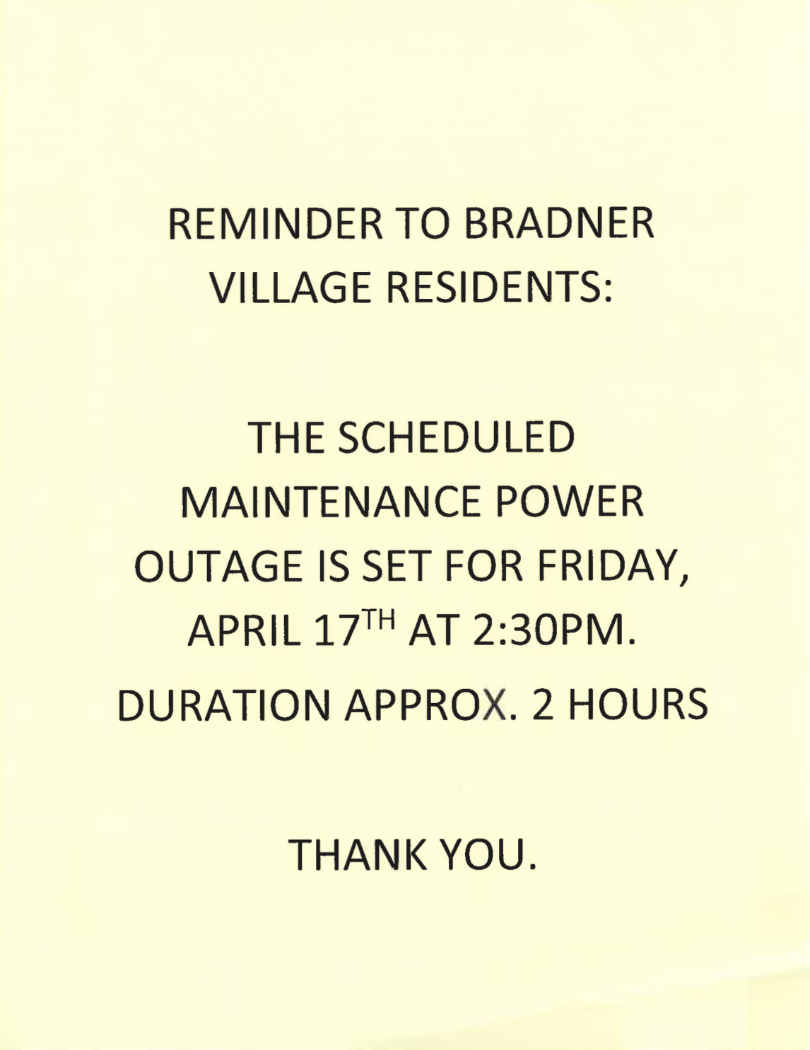 Reminder: Scheduled Power Outage – Friday, April 17th